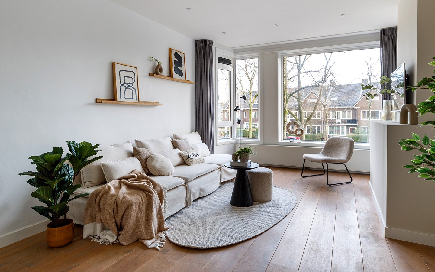 Bij binnenkomst valt het overvloedige natuurlijke licht op, dat via de grote raampartijen het appartement vult. De praktische indeling met een ruime doorzonwoonkamer creëert een open en luchtige sfeer. Een bijzonder element zijn de zichtlijnen vanuit de erker, die een prachtig uitzicht bieden over de groene Lessinglaan.