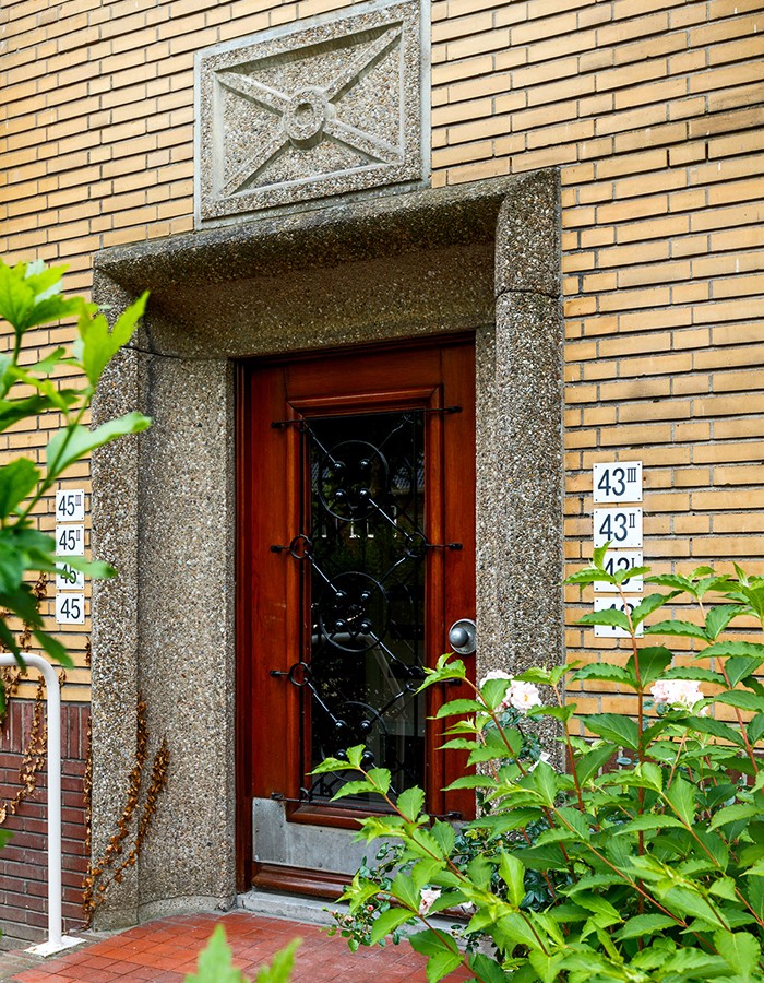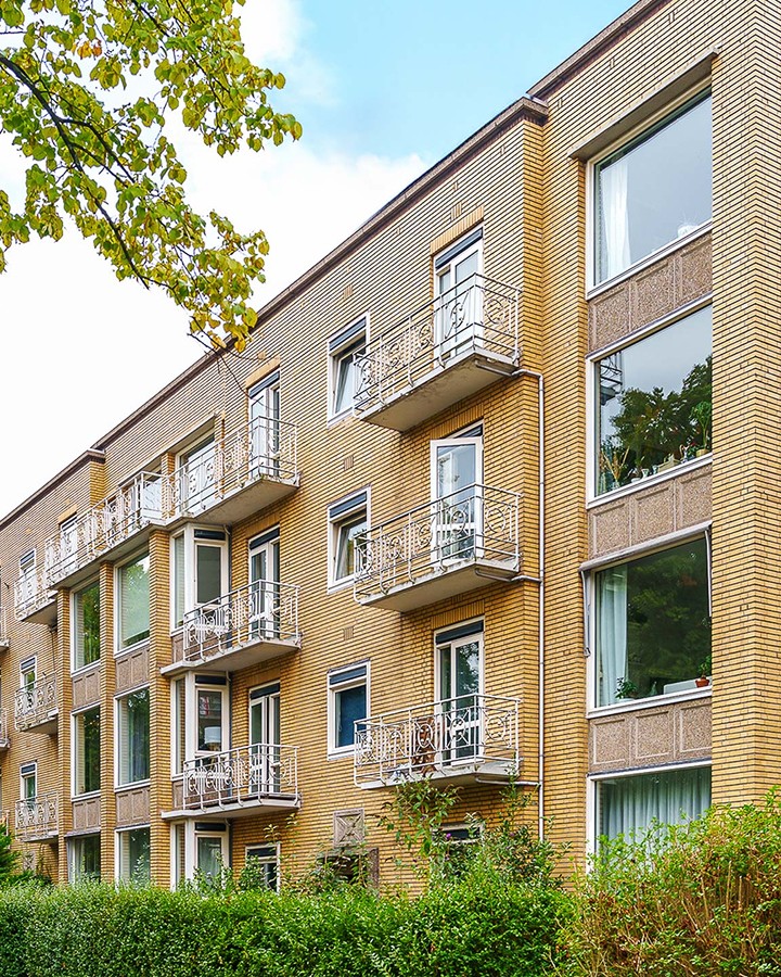 Ook bij het betreden van het gebouw springt het karakteristieke exterieur direct in het oog: charmante erkers, gedetailleerde balustrades en grote raampartijen, die samen de charme en uitstraling van de jaren ’50 behouden, maar met een moderne twist.